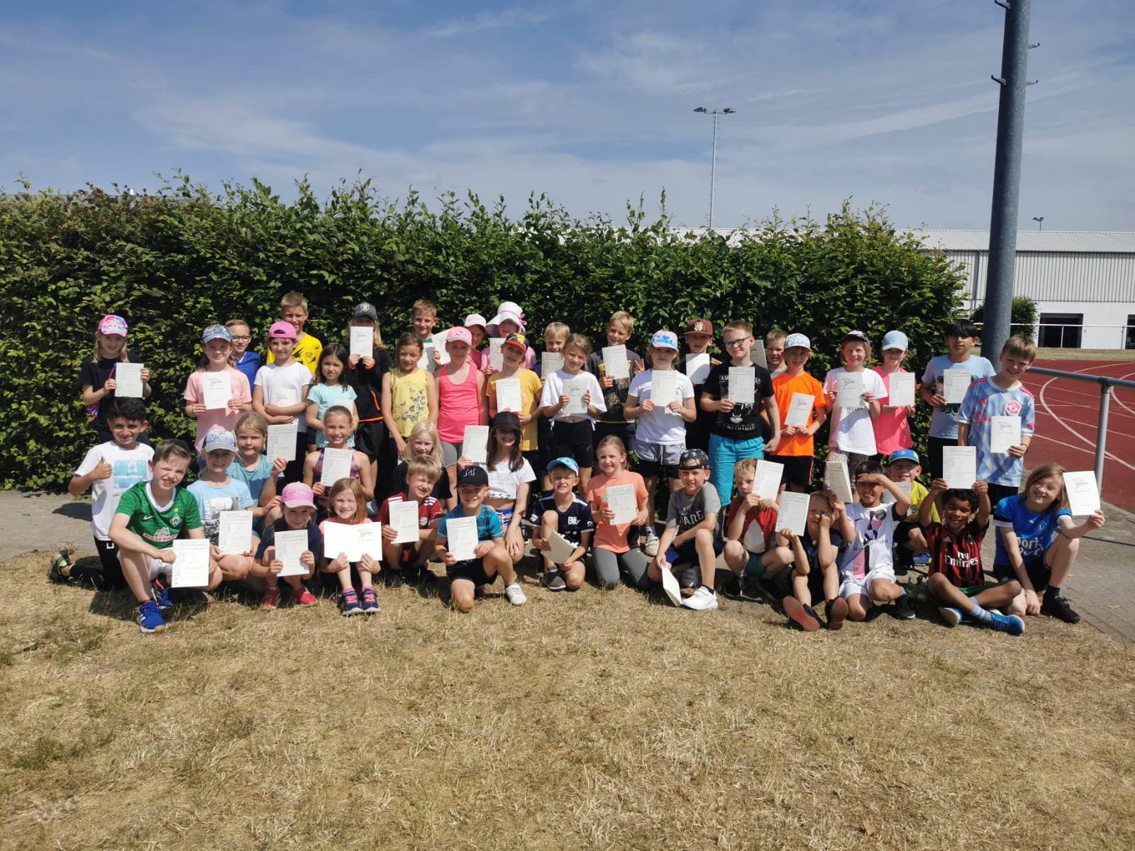 Am Ende des Vormittages wurden die Ehrenurkunden auf dem Sportplatz verliehen. Die Ausbeute war groß: Über 40 Kinder haben herausragende sportliche Leistungen erbracht. Aber das Wichtigste ist, dass jeder sein Bestes gegeben hat. Das war das Motto des Tages.