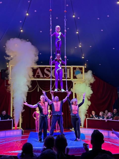 Nach der Pause ging es mit den Seiltänzerinnen weiter und die "Trampolinos" flogen mit Hilfe ihres Trampolins durch die Manege.