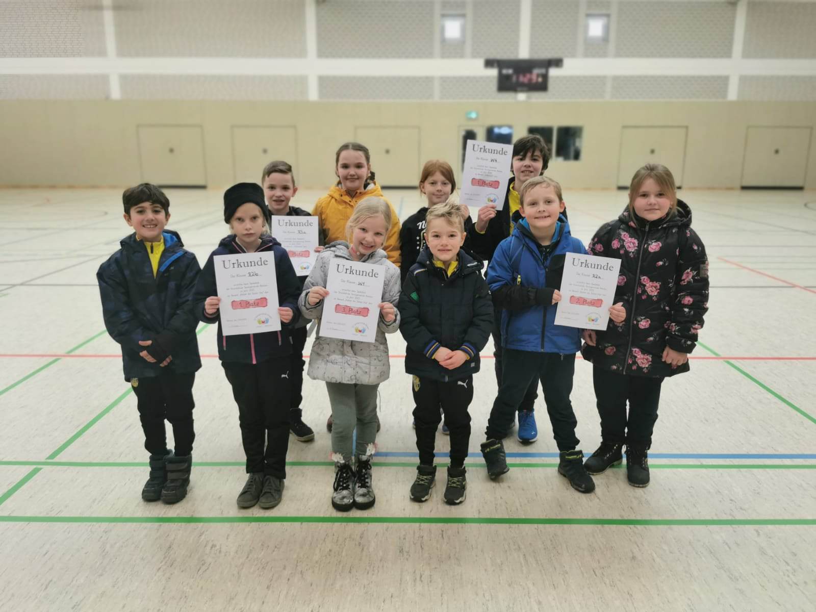 Am Ende des Vormittags wurde es spannend, denn die große Siegerehrung stand an, bei der jede Klasse für ihre Leistungen einen großen Applaus erhielt. Zusätzlich wurden die Klassen R2b, R2a und W1 (Platz 1, 2 und 3 bei „Haltet die Seiten frei“) sowie die Klassen R3a und W4 (Jeweils Platz 1 beim „Völkerball“) mit Urkunden ausgezeichnet. Wieder in der Schule angekommen, gab es für jeden Teilnehmer noch eine kleine Überraschung: Mit einer Medaille wurden alle Kinder ins Wochenende verabschiedet.