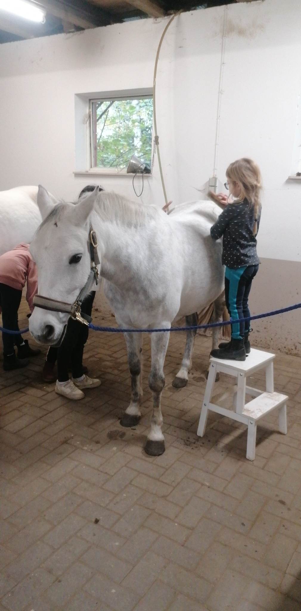 Seit Beginn des neuen Schuljahres fahren nun 10 Kinder wöchentlich zum Reitclub Donstorf-Drentwede, wo sie schon Vieles über Pferde erfahren haben. Sie wissen nun zum Beispiel, dass Pferde Steppen-, Herden- und Fluchttiere sind, was sie fressen oder wie man die Stimmung der Pferde erkennt. Aber auch in der Praxis werden die Kinder immer sicherer. Selbstständiges Führen und Putzen sind kein Problem mehr und auch beim Reiten und Voltigieren werden sie immer mutiger.