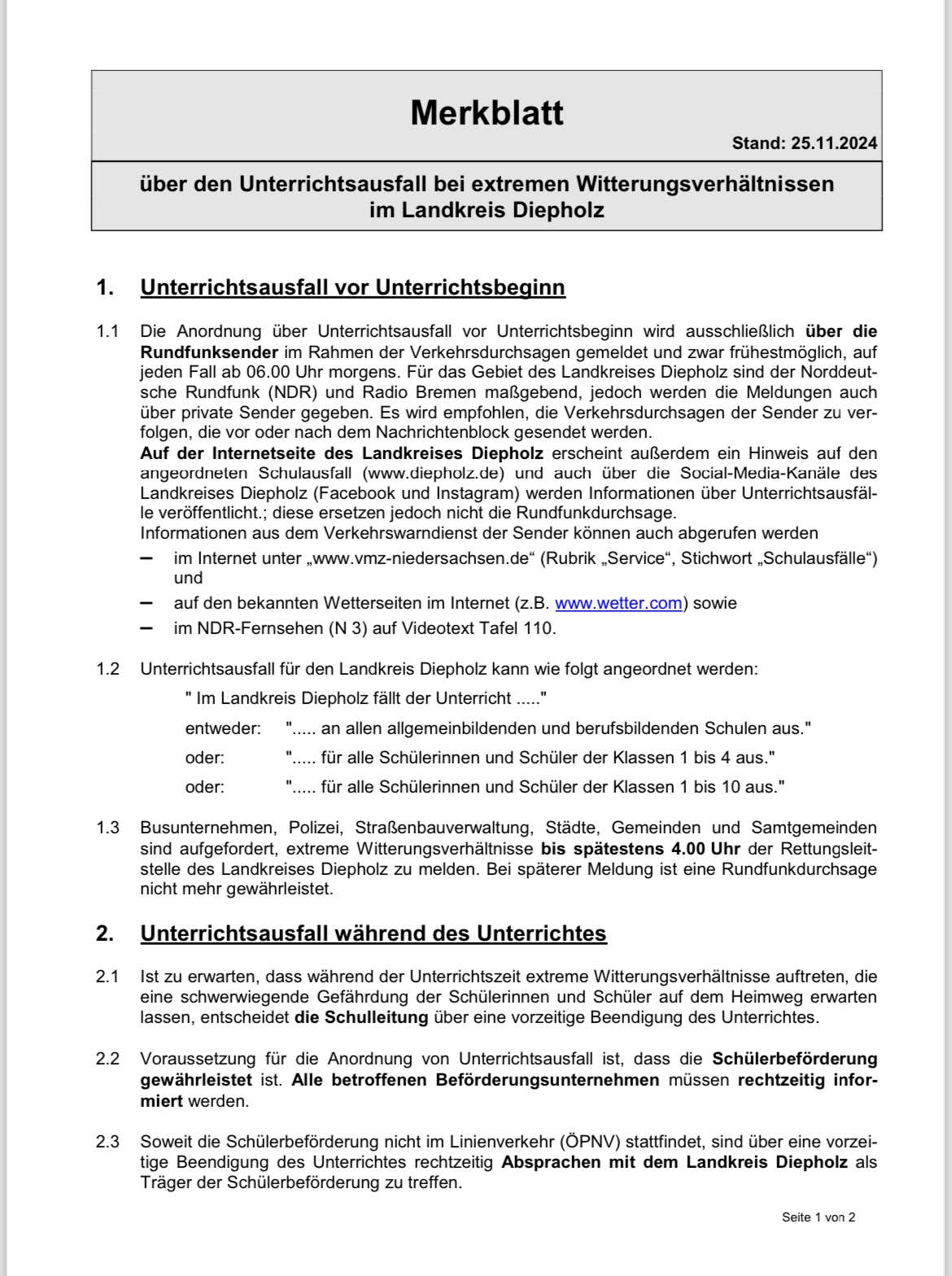 die Temperaturen werden kälter und die Winterzeit beginnt. Daher kann es in den kommenden Wintermonaten zu einem witterungsbedingten Schulausfall kommen. Alle wichtigen Informationen zu diesem Szenario können Sie dem folgenden Merkblatt entnehmen.